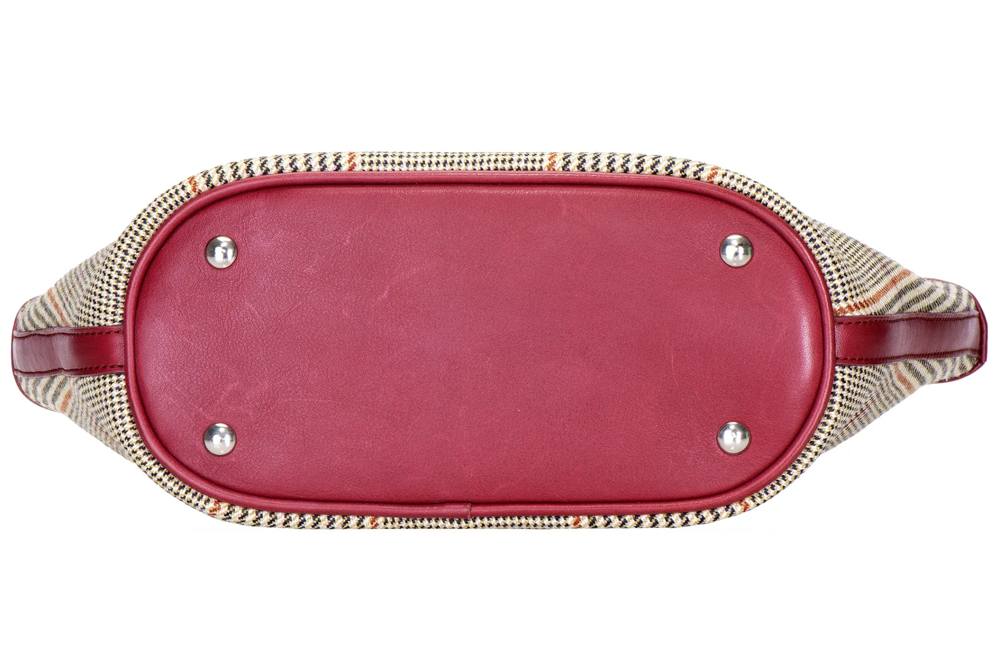 In luxuriously soft Burgundy Leather and durableRussell Tweed, this understated mini tote is more than meets the eye.Theexquisite straps and custom hardware are specially engineered to fit together seamlessly. A center zip pocket keeps your wallet secure and an outside pocket that is smartphone perfect. Dimensions – 14″(length) X 9″(height) X 5″(depth)