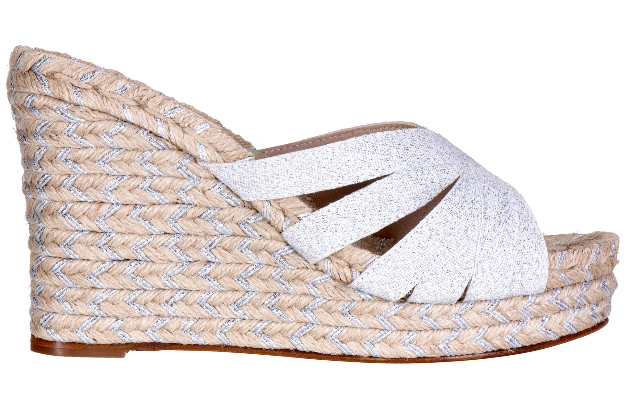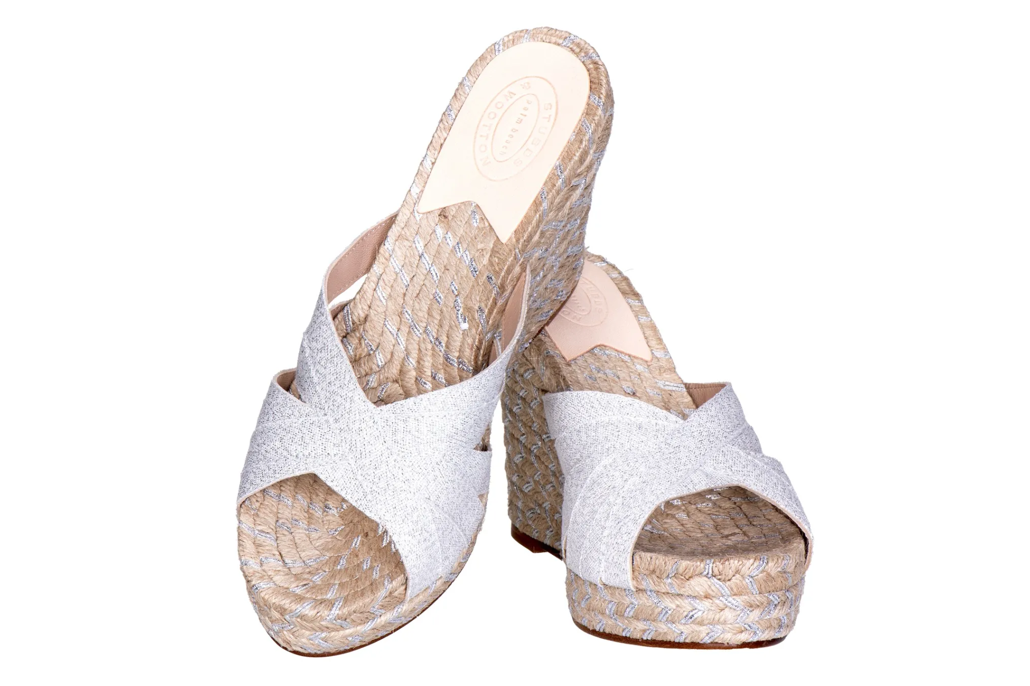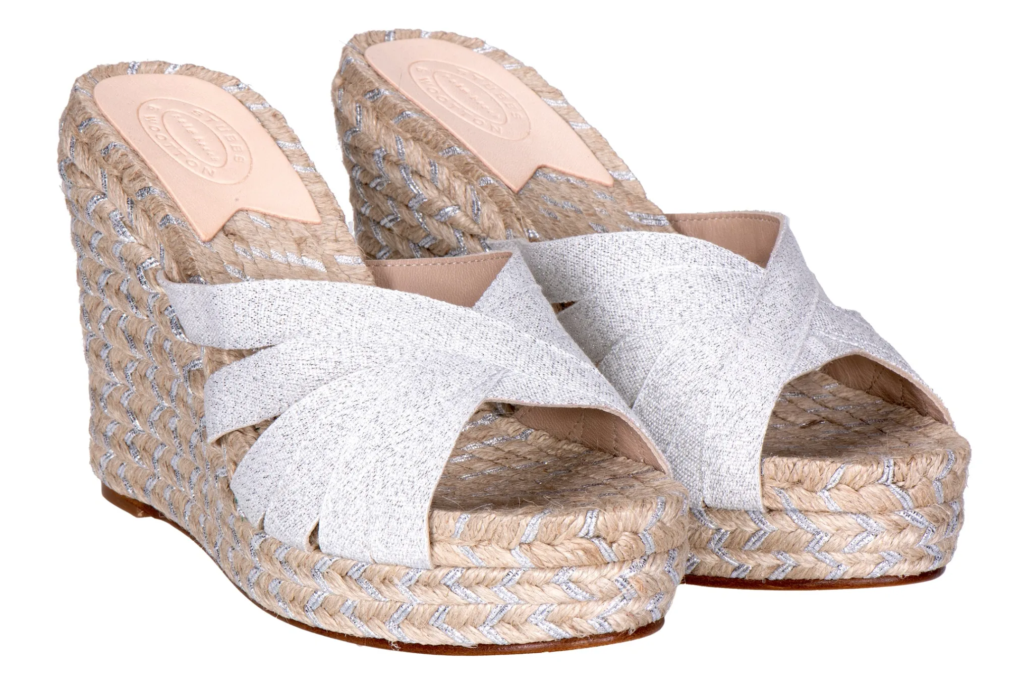 Our Silver Braid Grace Espadrillefeatures a SilverFleckRibbon and Jute Sole. Meticulously Hand-crafted in Spain. The heel is 5 inches in height. Leather soled. True to American sizing. If you wear a half size typically, go to the size up.