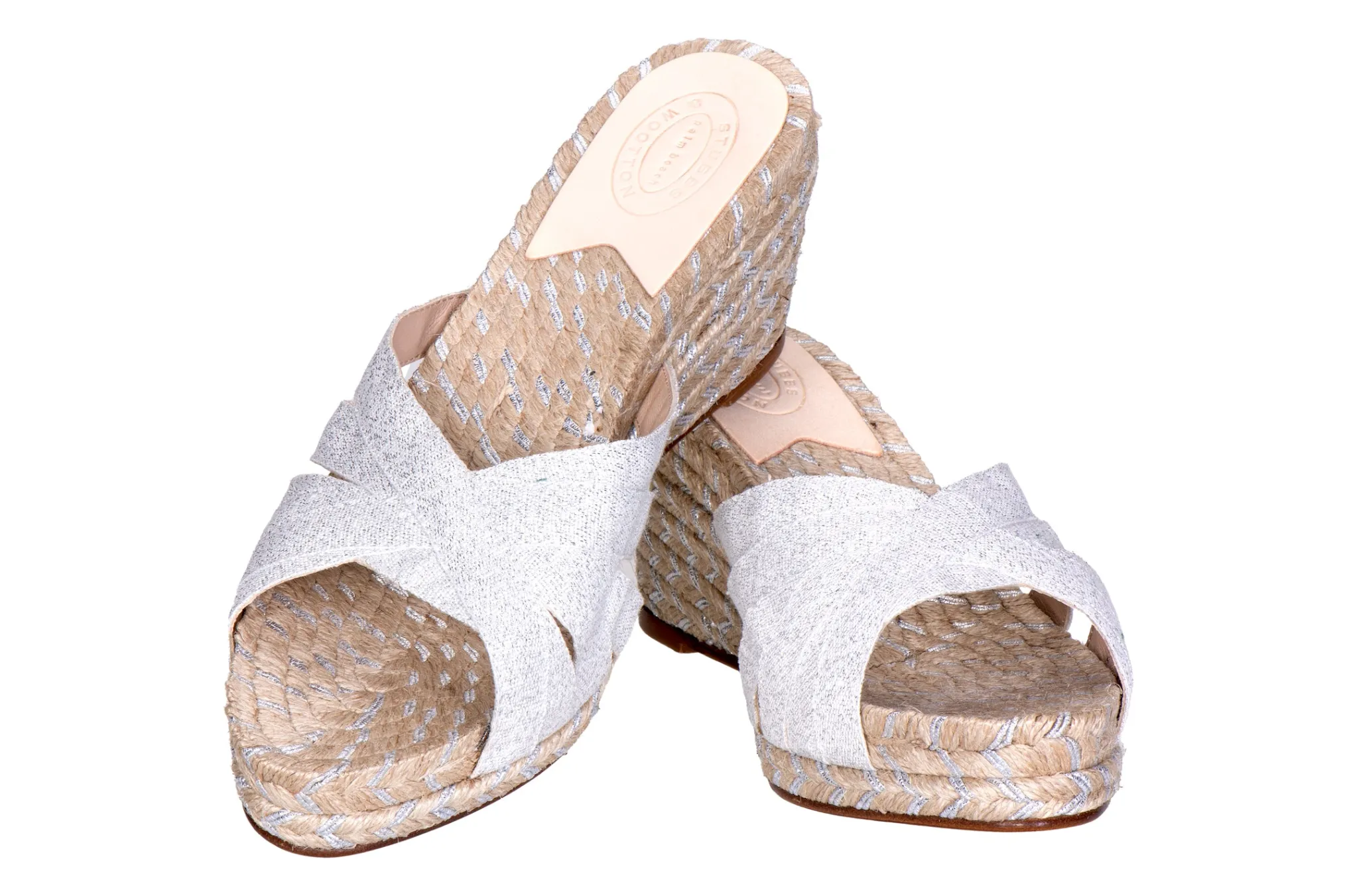 Our SilverBraid KellyEspadrille features a SilverFleckRibbon and Jute Sole. Meticulously Hand-crafted in Spain. The heel is 3 inches in height. Leather soled. True to American sizing. If you wear a half size typically, go to the size up.