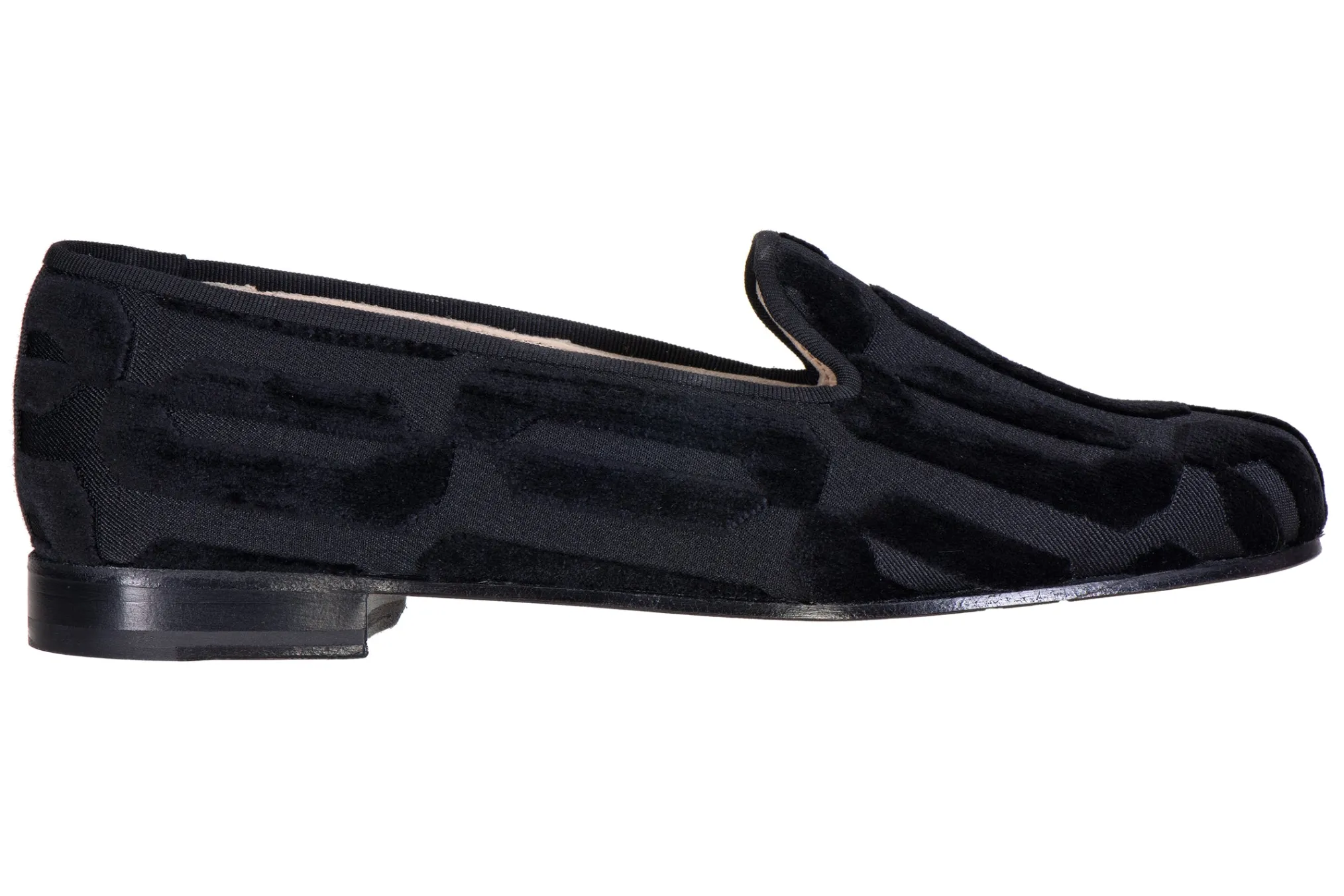 Our newest addition to our Scalamandré collection, this fabric shows a geometric motif embossed on velvet in multiple rich deep and cool shades. Our Typo Smoking slipper features a rich velvet fabric with a tonal black grosgrain. Meticulously Hand-crafted in Spain. Leather lined to provide additional support and comfort. The stacked wooden heel is 3/4″ in height. Leather soled. True to American sizing.