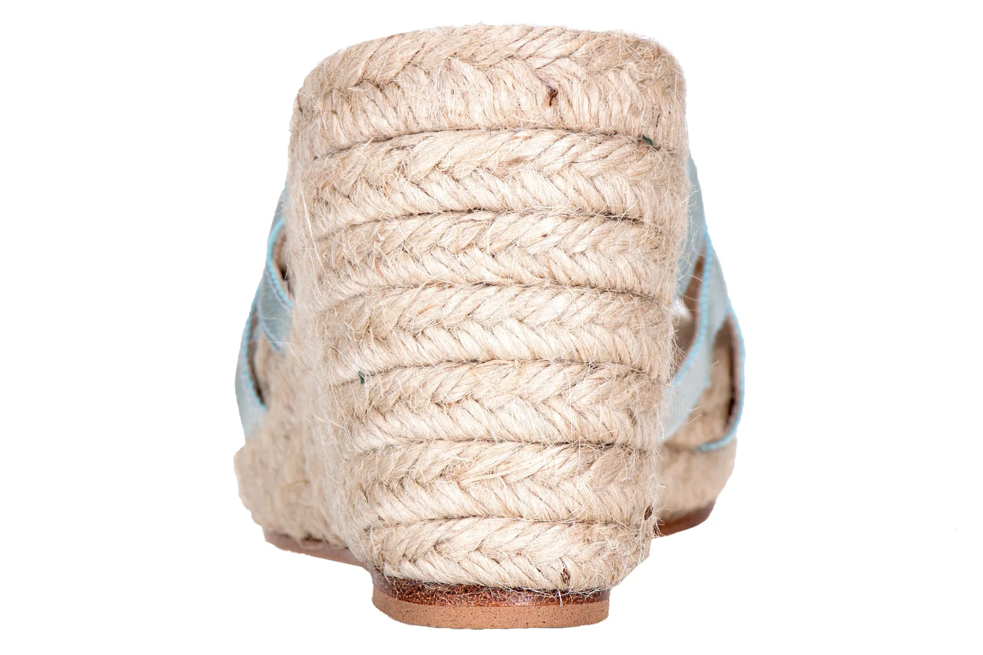 Our Kelly Rib Aqua Espadrille features a Blue Grosgrain Ribbon and Jute Sole. Meticulously Hand-crafted in Spain. The heel is 3 inches in height. Leather soled. True to American sizing. If you wear a half size typically, go to the size up.