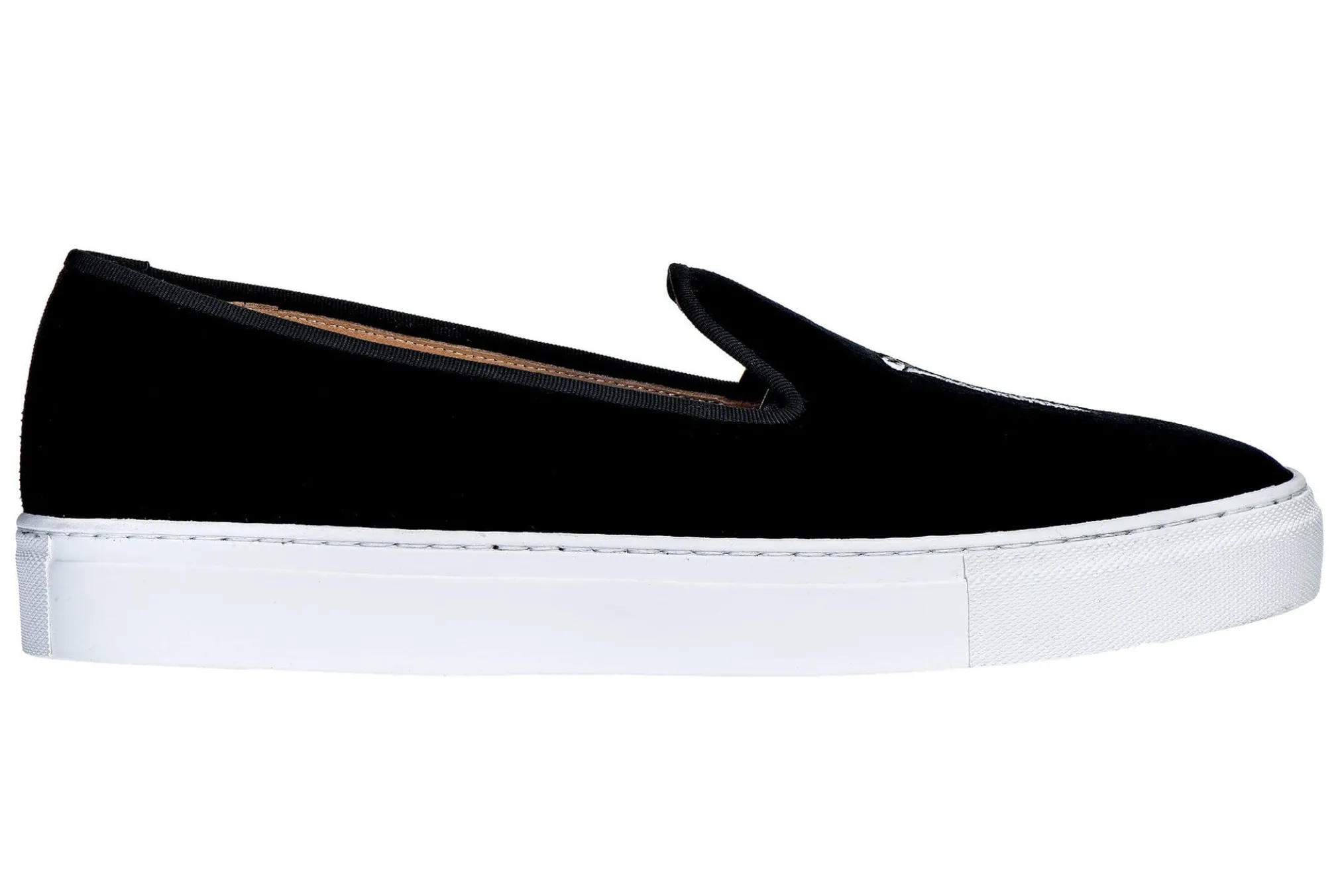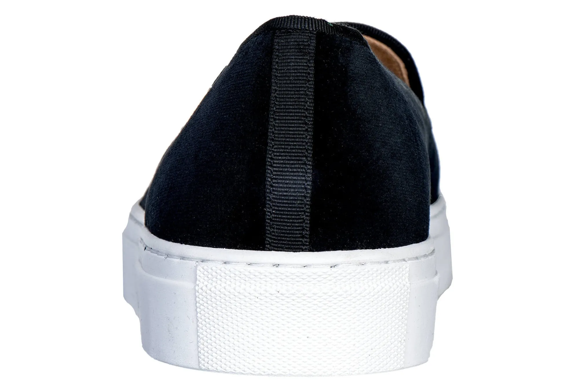 Our College Velvet Sneaker features a Black Spanish Cotton-Velvet Upper with a Black Grosgrain Trim. Finished off with our tongue in cheek “Screw You” embroidery. Meticulously Hand-crafted in Spain. Leather lined to provide additional support and comfort. The rubber sole is .75 in height. We recommend going half a size down, if between sizes.