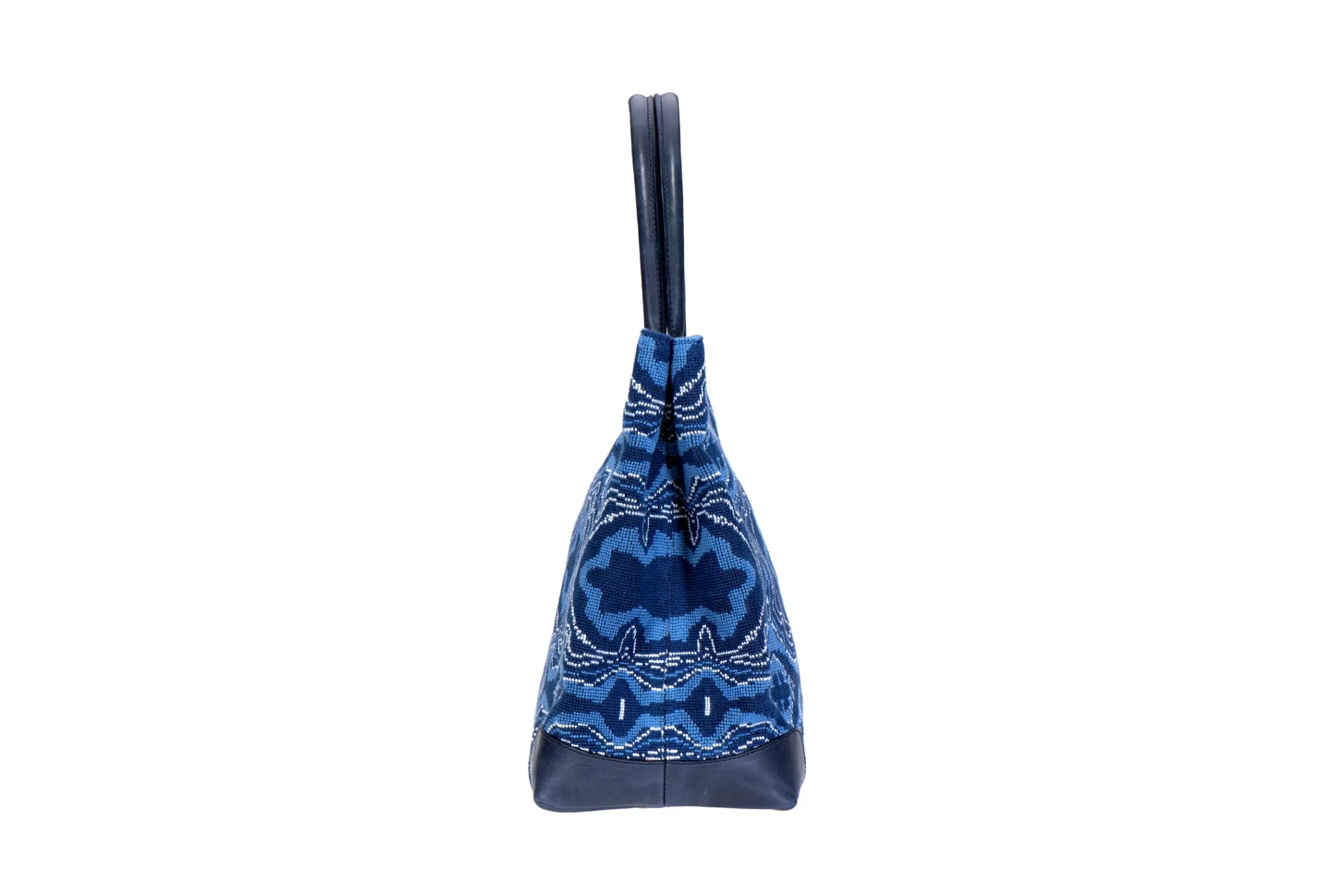 Our Lazurite Tote features our blue lazurite needlepoint pattern with deep navy leather detailing. Perfect for day trips and overnight stays! Dimensions -17″ X 13″X 8″