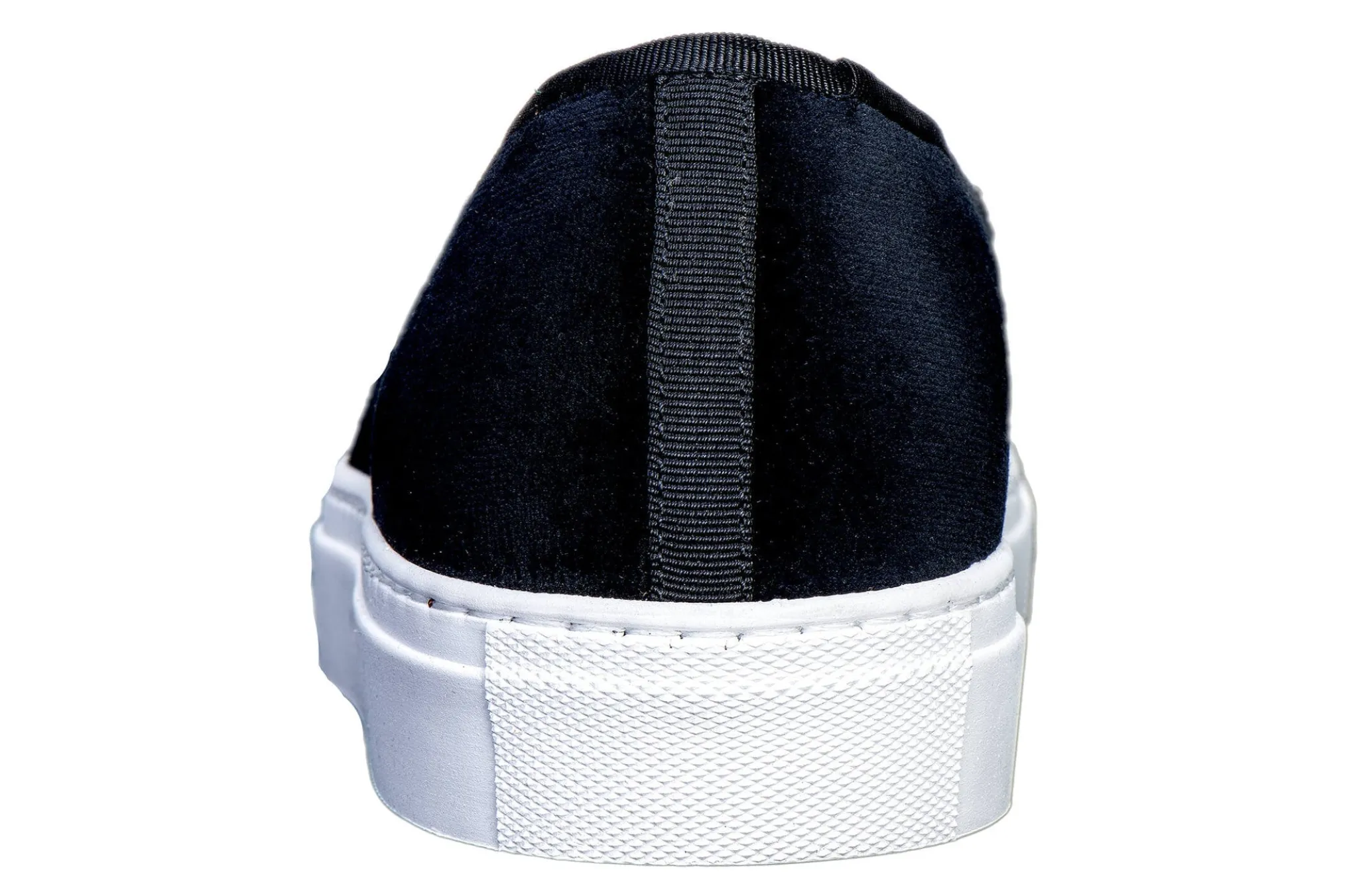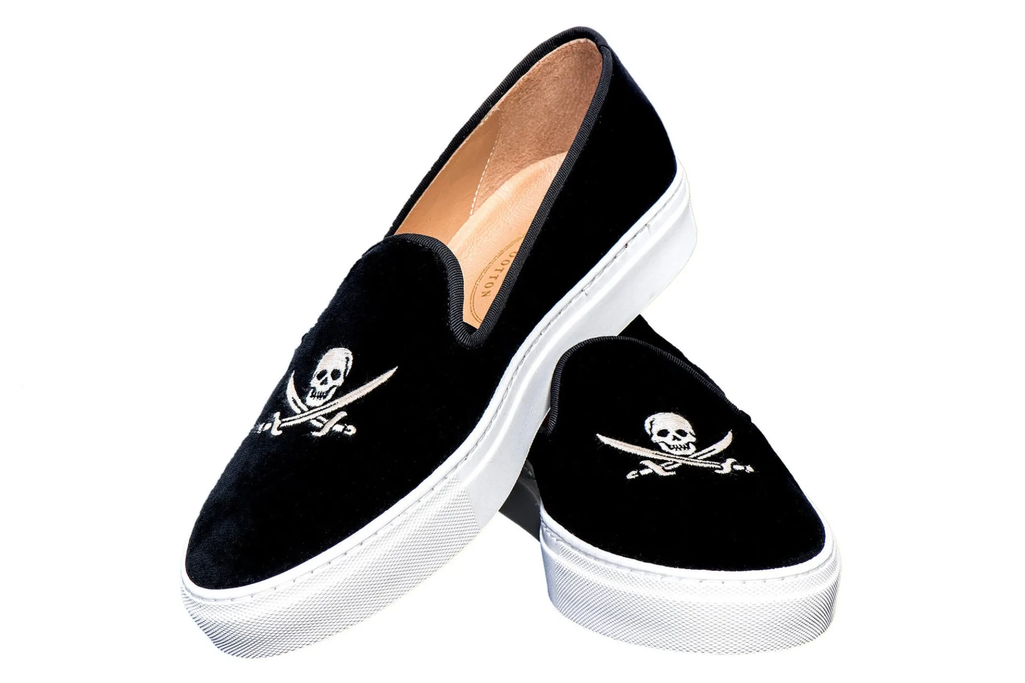 Our Skull Velvet Sneaker features a Black Spanish Cotton-Velvet Upper with a Black Grosgrain Trim. Finished off with our Jolly Roger Skull embroidery. Meticulously Hand-crafted in Spain. Leather lined to provide additional support and comfort. The rubber sole is .75 height. We recommend sizing down in our sneakers, if between sizes.